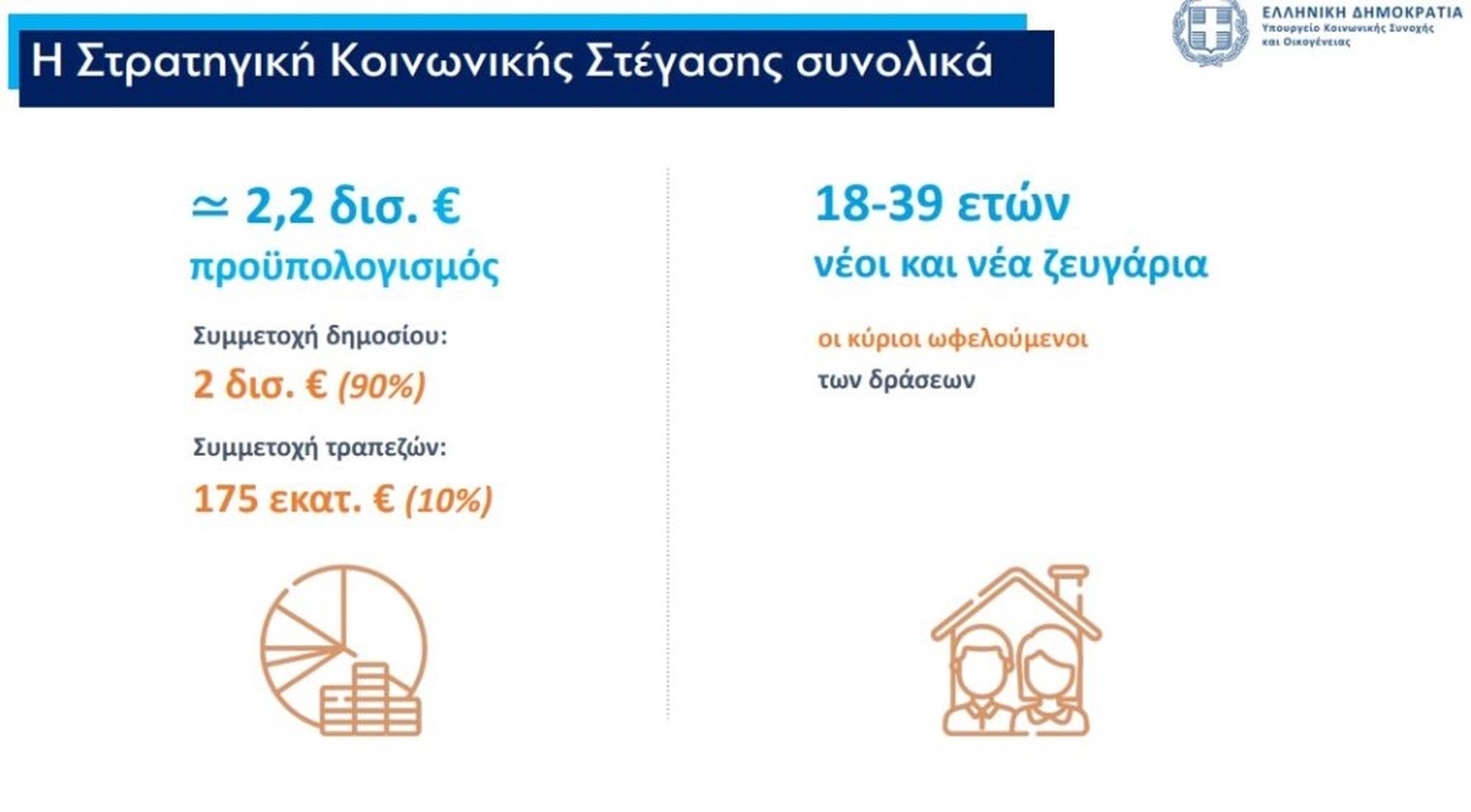 Στόχοι της στεγαστικής πολιτικής είναι η μείωση του υψηλού κόστους της στέγασης, η αύξηση της ιδιοκατοίκησης των νέων, η στήριξη σε νέους και νέα ζευγάρια για στεγαστική αποκατάσταση, ο εκσυγχρονισμός και η αναβάθμιση παλαιών ακινήτων, η άμβλυνση των στρεβλώσεων της στεγαστικής αγοράς, κίνητρα για φθηνές μακροχρόνες μισθώσεις καθώς και η αντιμετώπιση του δημογραφικού προβλήματος.