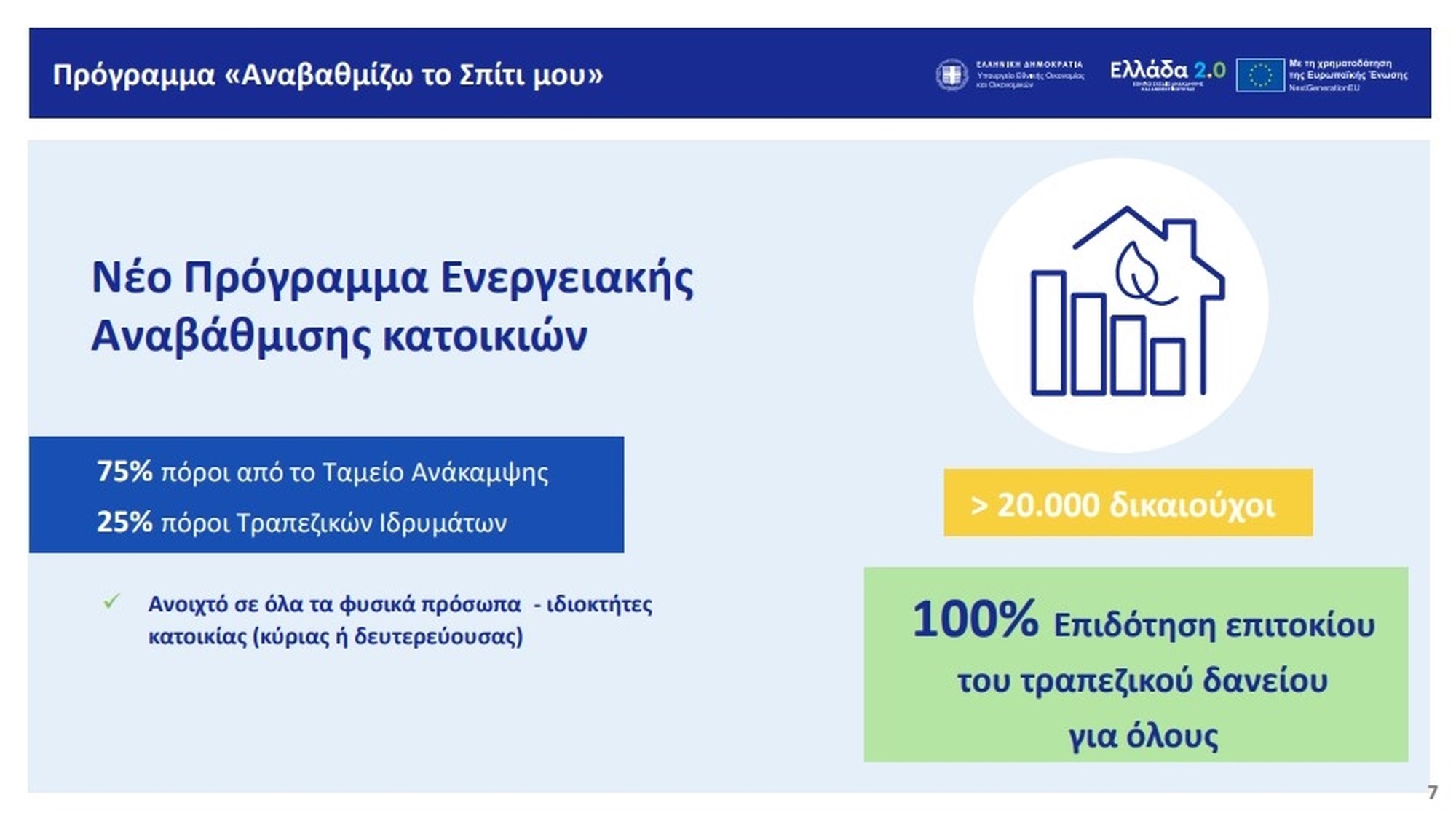 Σχετικά με τη χρηματοδότηση του προγράμματος "Αναβαθμίζω το Σπίτι μου" το 75% είναι πόροι από το Ταμείο Ανάκαμψης και το 25% πόροι Τραπεζικών Ιδρυμάτων. Είναι ανοιχτό σε όλα τα φυσικά πρόσωπα – ιδιοκτήτες κατοικίας (κύριας ή δευτερεύουσας).