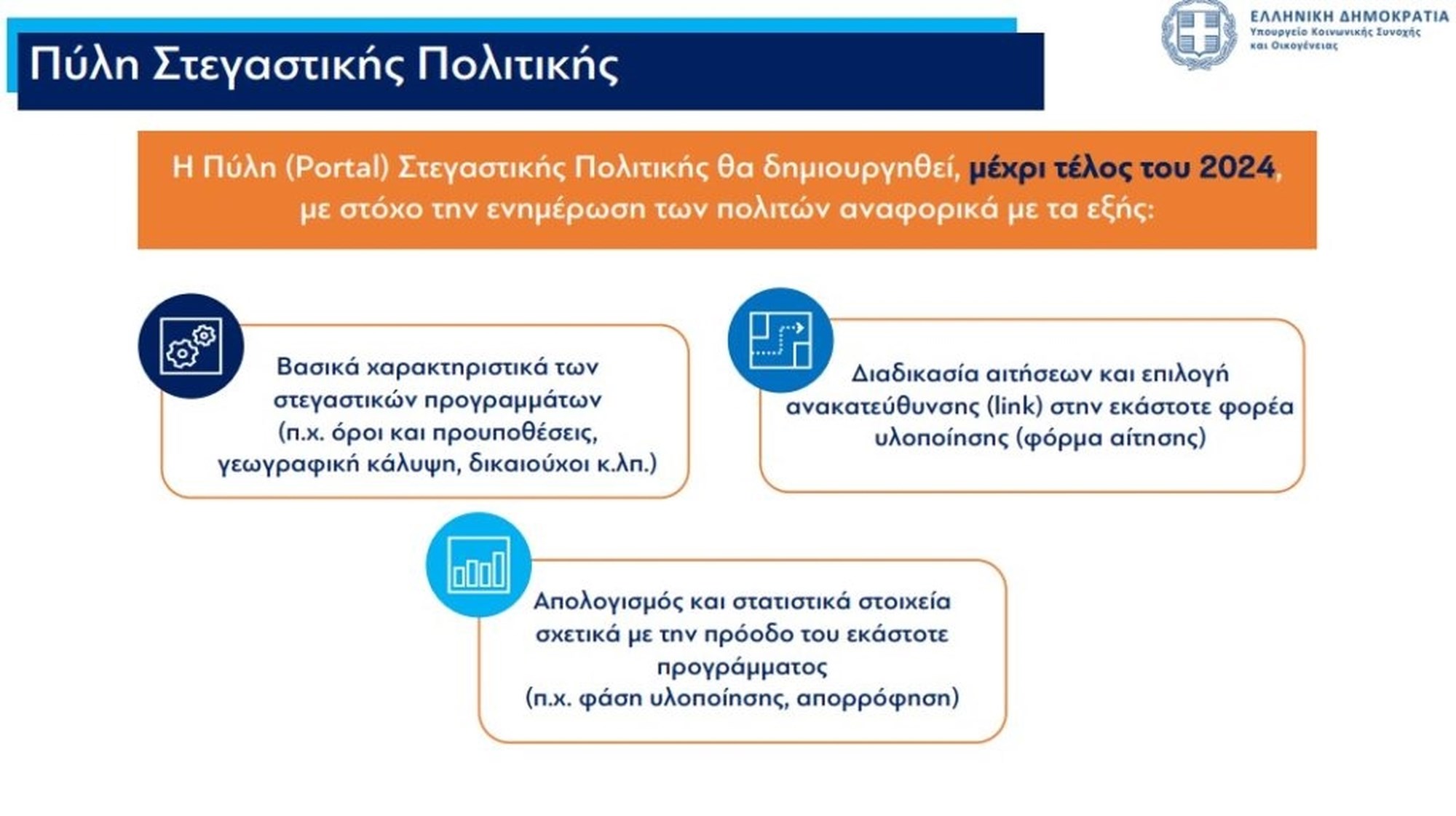 Για τη στέγαση και την εργασία για τους αστέγους με τη νέα πρόσκληση προβλέπεται αύξηση του Π/Υ από 10 εκατομμύρια σε 15 εκατομμύρια ευρώ ανα διετία και αναμένεται αύξηση του αριθμού των νοικοκυριών από 558 σε 700. Σκοπός του προγράμματος είναι η στήριξη ατόμων και οικογενειών που διαβιούν σε συνθήκες έλλειψη στέγης. Στόχος η επέκταση του προγράμματος έτσι ώστε να υλοποιηθεί σε 60 δήμους σε όλη τη χώρα.