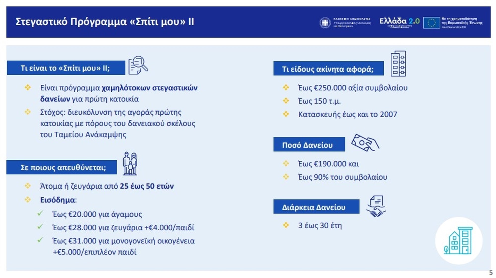 Στο νέο πρόγραμμα Σπίτι μου ΙΙ διευρύνονται τα ηλικιακά κριτήρια των δικαιούχων έως τα 50 έτη όπως και τα εισοδηματικά κριτήρια. Συγκεκριμένα απευθύνεται σε άτομα ή ζευγάρια από 25 έως 50 ετών με εισόδημα έως 20.000€ για άγαμους, έως 28.000€ για ζευγάρια + 4.000€ ανά παιδί, έως 31.000€ για μονογονεϊκή οικογένεια και 5.000€ επιπλέον για κάθε παιδί. Αφορά ακίνητα που έχουν αξία συμβολαίου έως 250.000€, έως 150 τετραγωνικά μέτρα και κατασκευής έως και το 2007.