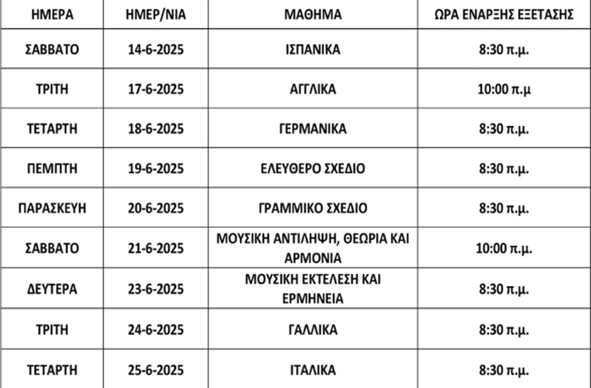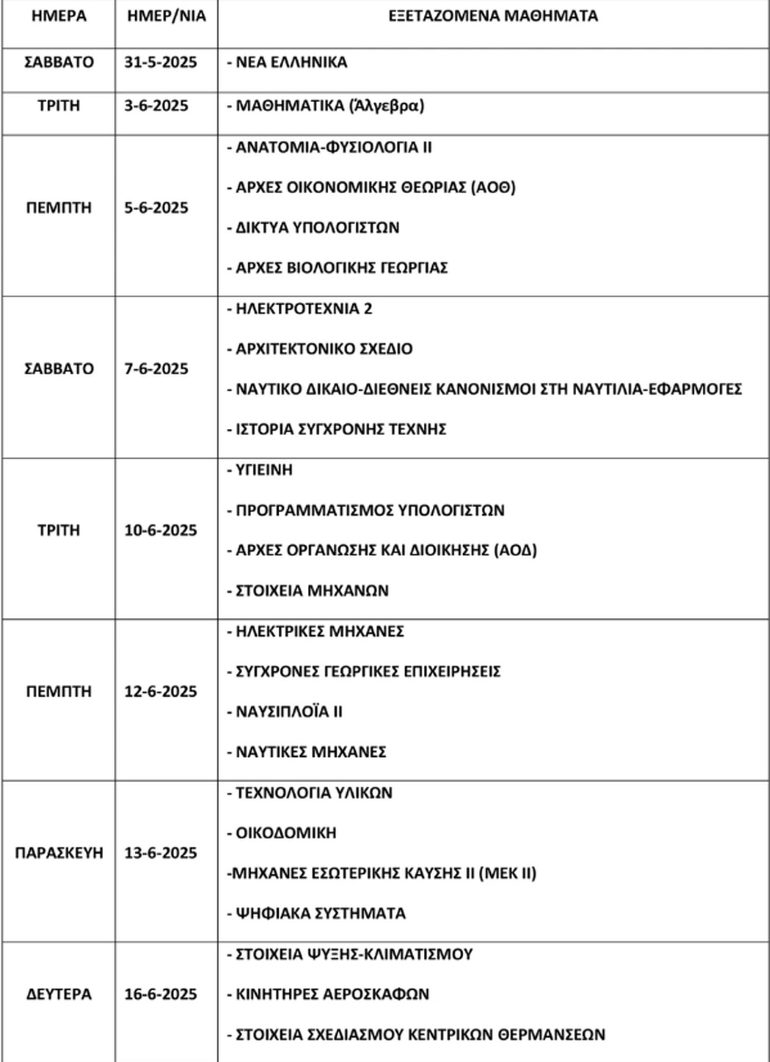 Μια μέρα νωρίτερα, την Πέμπτη 29 Μαϊου θα ξεκινήσουν οι εξετάσεις για τα ΕΠΑΛ και θα ολοκληρωθούν την Δευτέρα 16 Ιουνίου.