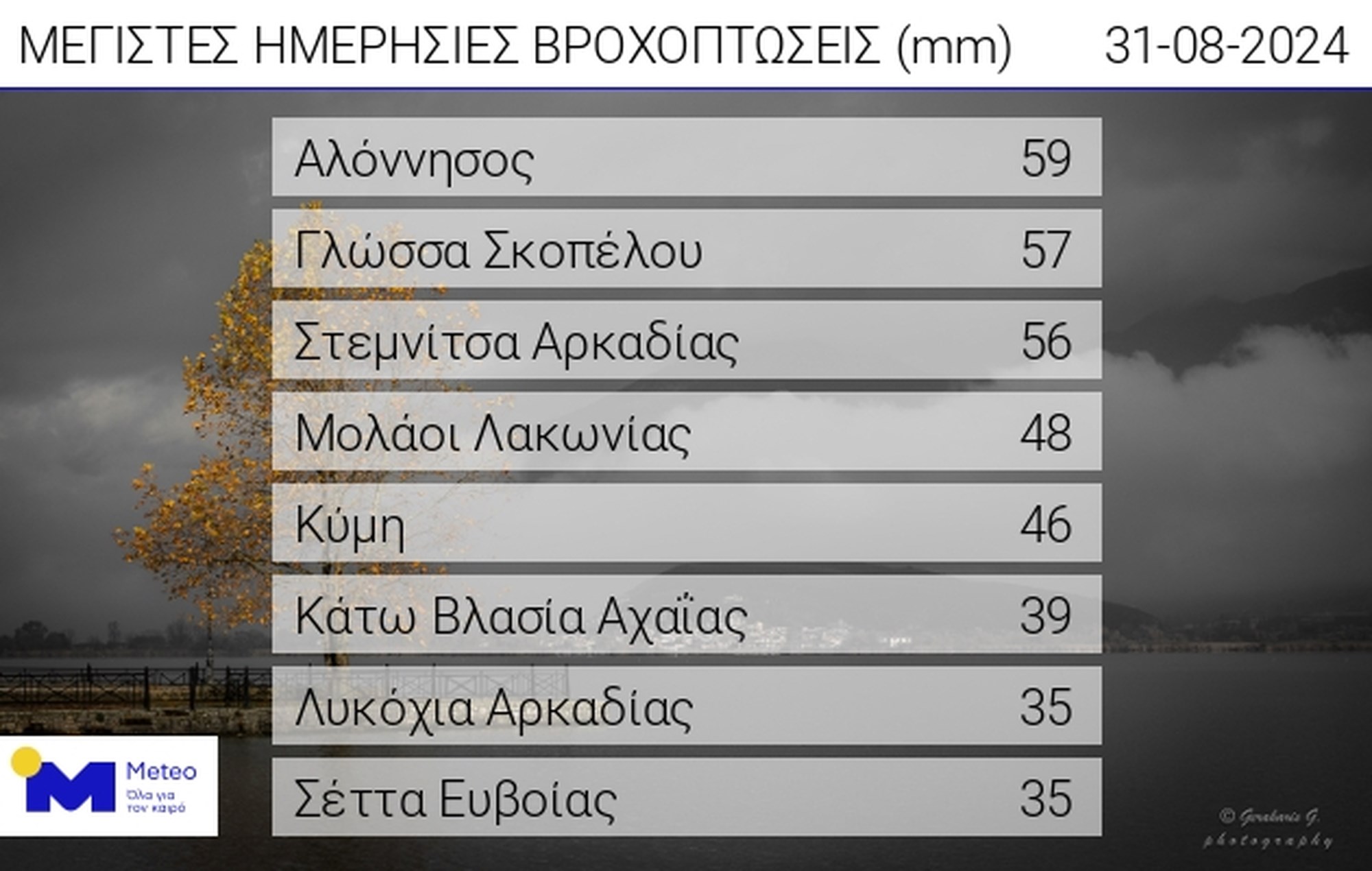 Στον σχετικό πίνακα παρουσιάζονται οι 8 σταθμοί του δικτύου που κατέγραψαν τα μεγαλύτερα ύψη βροχής έως τις 18:00 περίπου του Σαββάτου 31/08.