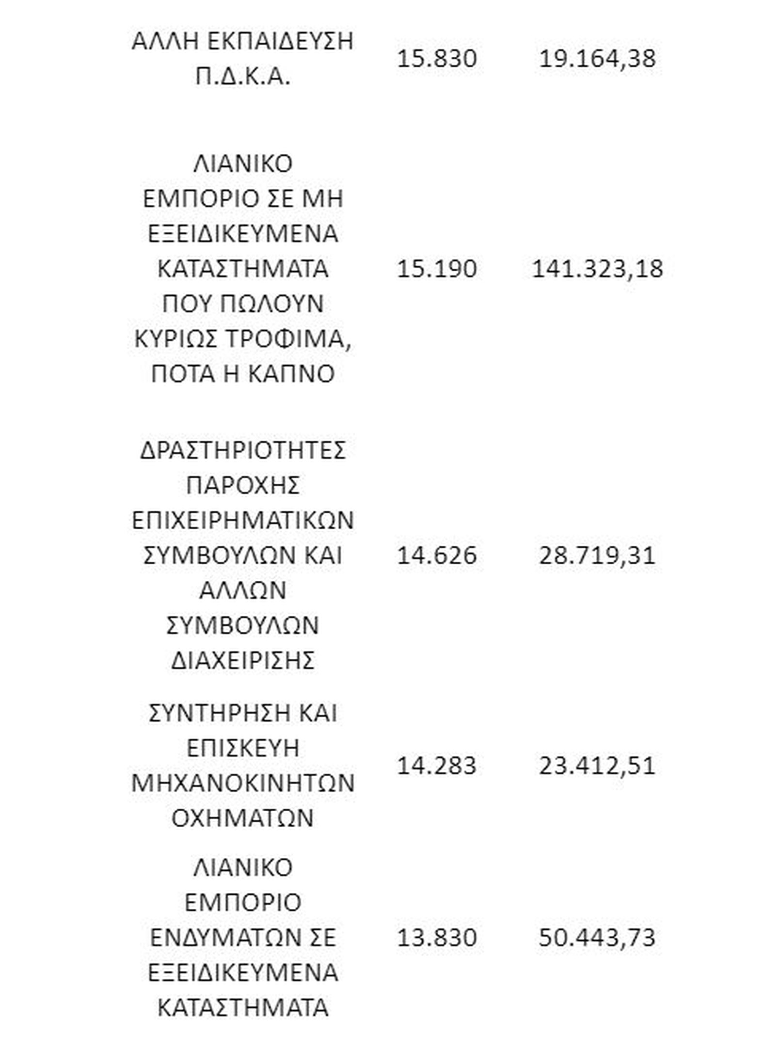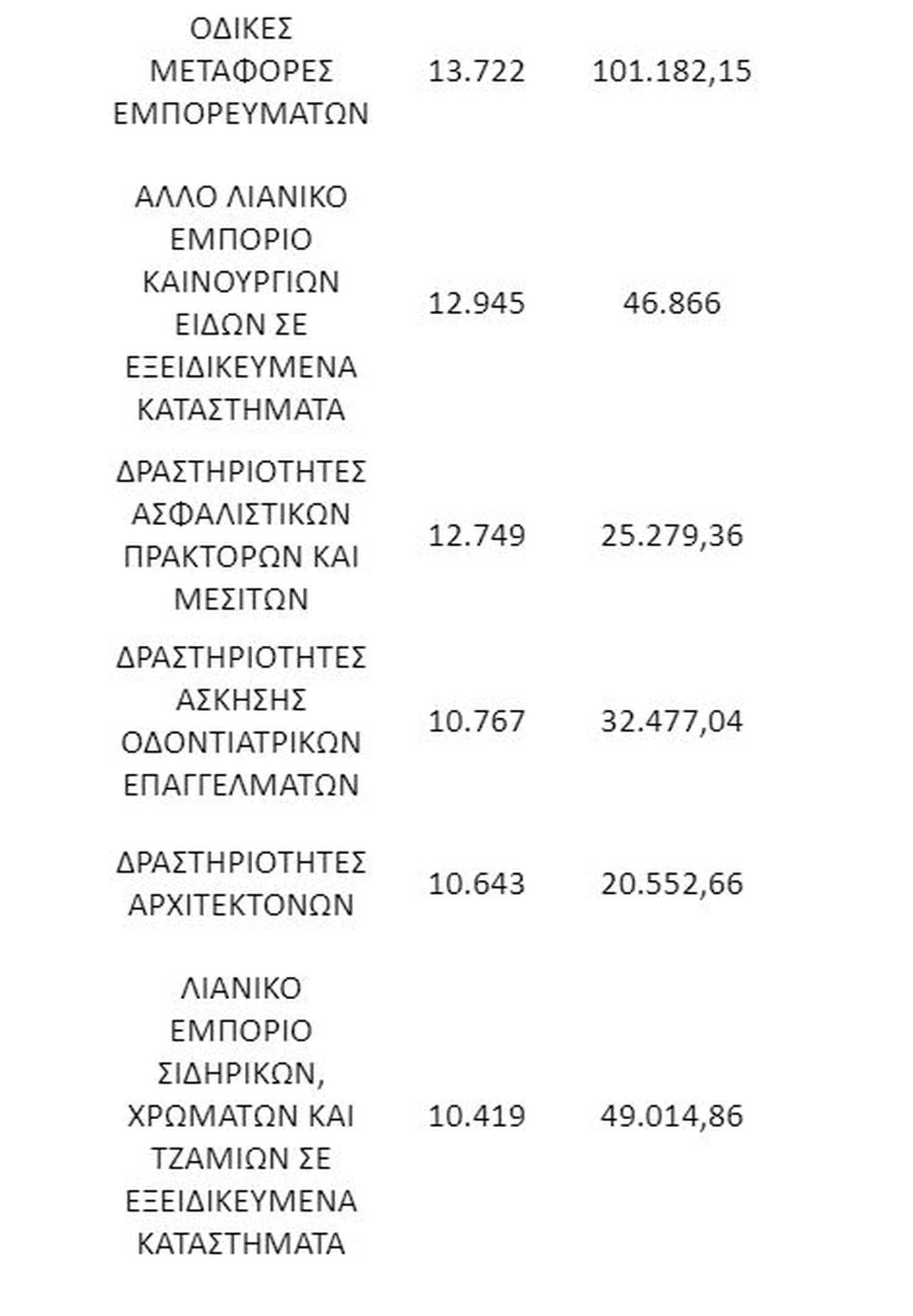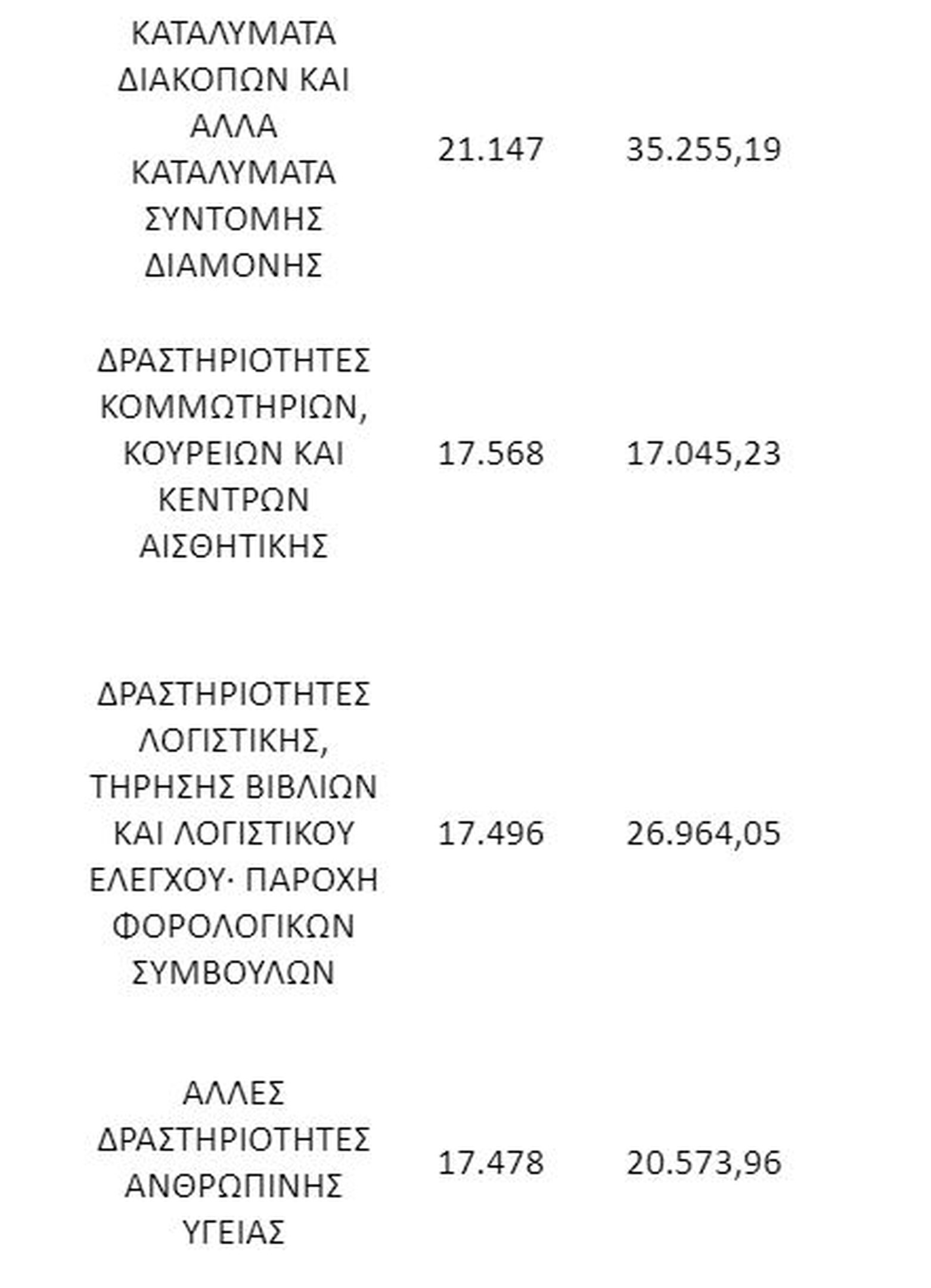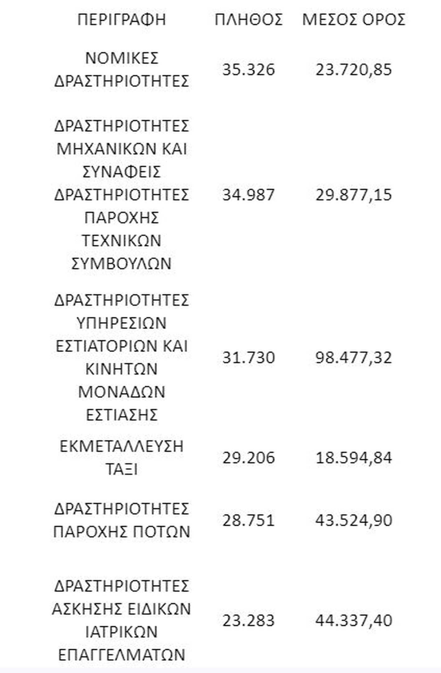 Αποκαλυπτικά τα παραδείγματα: μέσος ετήσιος τζίρος των κομμωτηρίων: 17.000 ευρώ τον χρόνο ή 1416 ευρώ τον μήνα. Μέσος ετήσιος τζίρος οδηγών ταξί, 18.594 ευρώ ή 1.549 ευρώ τον μήνα και μέσος τζίρος στα μπαρ: 43.524 ευρώ ή 3.627 ευρώ τον μήνα.