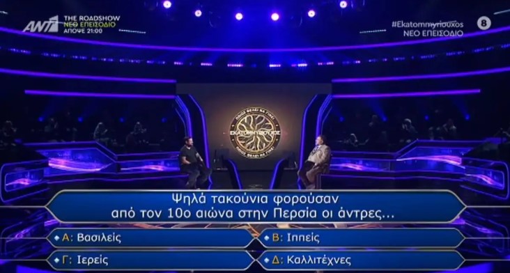 Η ερώτηση που κλήθηκε να απαντήσει ήταν «Ψηλά τακούνια φορούσαν από τον 10ο αιώνα στην Περσία οι άντρες...», με τις εξής επιλογές: «Βασιλείς, Ιππείς, Ιερείς, Καλλιτέχνες».