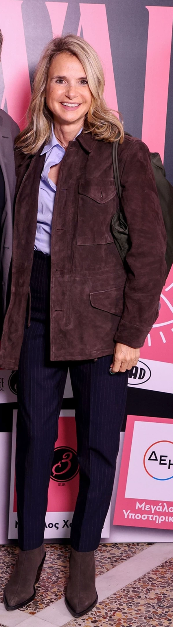 H βουλευτής του ΠΑΣΟΚ Μιλένα Αποστολάκη φόρεσε ριγέ ψηλόμεσο παντελόνι με γαλάζιο πουκάμισο, καστόρινο overshirt και αντίστοιχες μπότες.