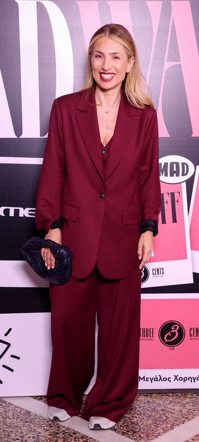 Η Μαρία Ηλιάκη ξέφυγε από το μαύρο επιλέγοντας ένα μπορντώ oversized κοστούμι και σνίκερς.