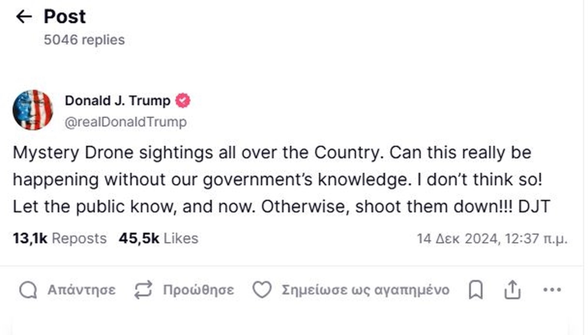Ο τρόπος που έχει αντιδράσει ο εκλεγμένος πρόεδρος των ΗΠΑ, Ντόναλντ Τραμπ, μπορεί ενδεχομένως να θεωρηθεί υπεραντίδραση. Με ανάρτησή του στη δική του πλατφόρμα social media, το Truth, έγραψε: "Μυστηριώδεις εμφανίσεις drone σε όλη τη χώρα. Μπορεί όλα αυτά να συμβαίνουν χωρίς να έχει γνώση η κυβέρνηση. Δεν το πιστεύω! Πείτε στον κόσμο τι συμβαίνει, τώρα. Διαφορετικά, ρίξτε τα!!!".