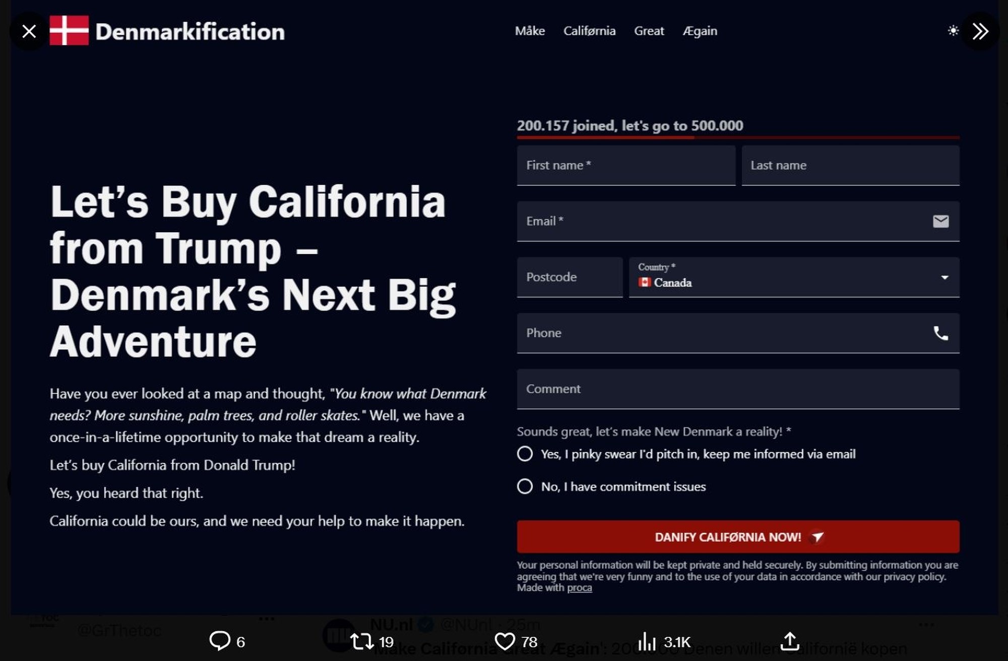 "Ας αγοράσουμε την Καλιφόρνια από τον Τραμπ - Η νέα μεγάλη περιπέτεια της Δανίας" γράφει το αίτημα που έχει υποστηριχθεί από πάνω από 200 χιλιάδες χρήστες του διαδικτύου ενώ φέρει τον τίτλο Denmarkification εκ του ...Californication.Στην κορυφή της ιστοσελίδας του αιτήματος, ένα σύνθημα καλεί σε "Måke Califørnia Great Ægain" και υποτιθέμενοι υποστηρικτές όπως ο Lars Ulrich των Metallica και ο Viggo Mortensen του διάσημου Άρχοντα των Δαχτυλιδιών εξηγούν τους λόγους γιατί πρέπει να γίνει η Καλιφόρνια "Νέα Δανία".