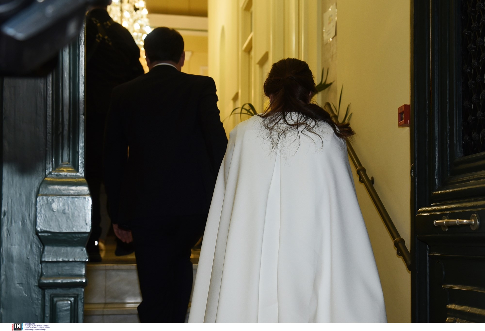 Η Δόμνα Μιχαηλίδου έλαμπε από ευτυχία μέσα στο λευκό φόρεμα σε γραμμή που να καλύπτει τη φουσκωμένη της κοιλιά.