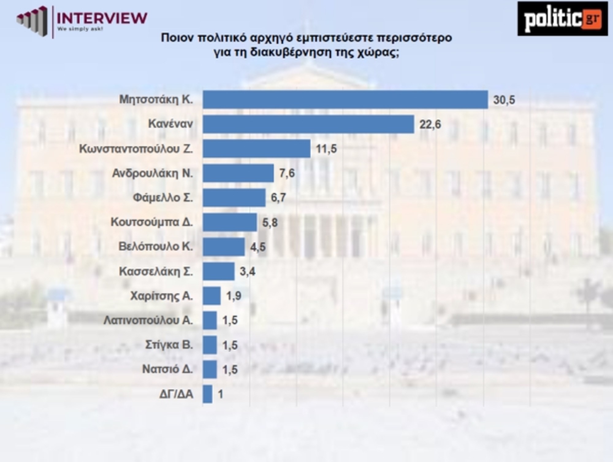 Αν και η κυβέρνηση της ΝΔ καταγράφει φθορά, ο Κυριάκος Μητσοτάκης εξακολουθεί να προηγείται στην ερώτηση για τον πολιτικό αρχηγό που εμπνέει περισσότερη εμπιστοσύνη στη διακυβέρνηση της χώρας, συγκεντρώνοντας 30,5%. Στη δεύτερη θέση είναι ο "Κανένας" με 22,6%.