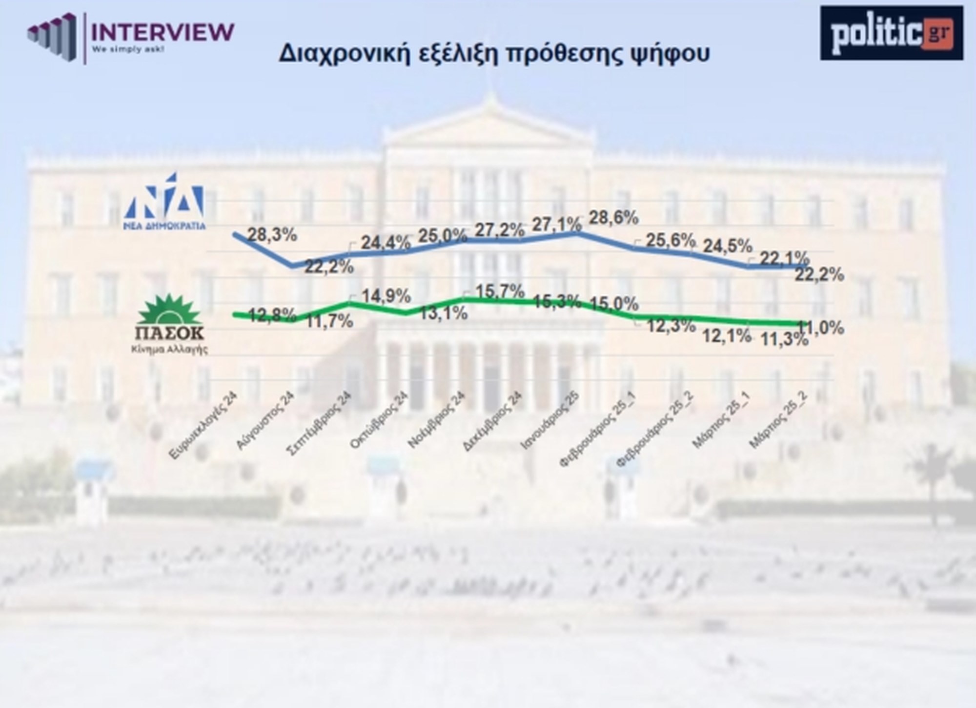 Παρά την προσπάθεια για διορθωτικές κινήσεις η δημοσκόπηση της Interview για λογαριασμό της POLITIC δείχνει ξεκάθαρα ότι η φθορά της κυβέρνησης είναι υπαρκτή και βαθαίνει, καθώς η ΝΔ από το 24,5% το Φεβρουάριο πέφτει στο 22,2% τον τρέχοντα μήνα.
