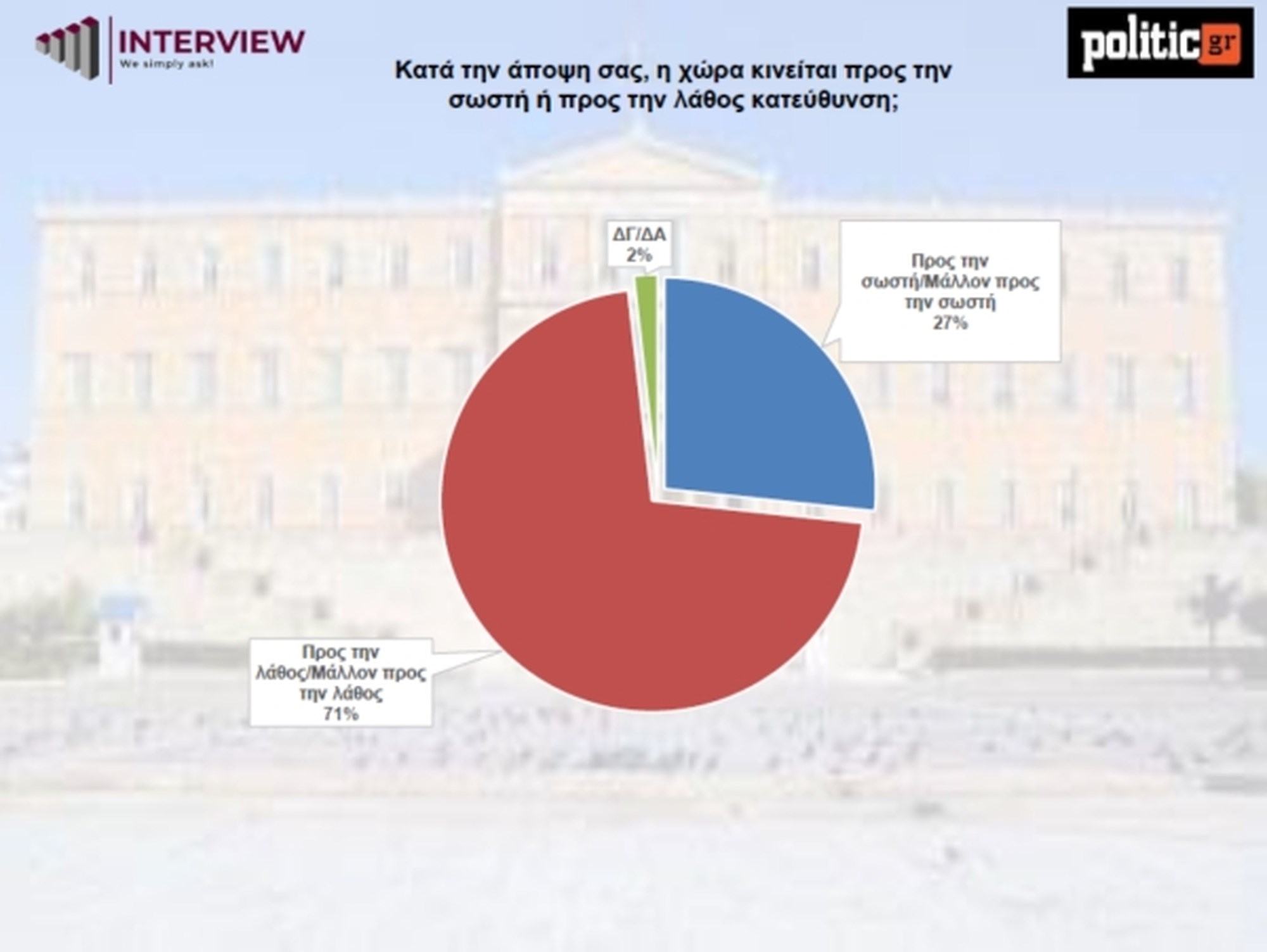 Το 71% των ερωτηθέντων εκτιμά πως η χώρα κινείται "προς τη λάθος" κατεύθυνση. Μόλις το 27% εκτιμά ότι η κατεύθυνση είναι σωστή.