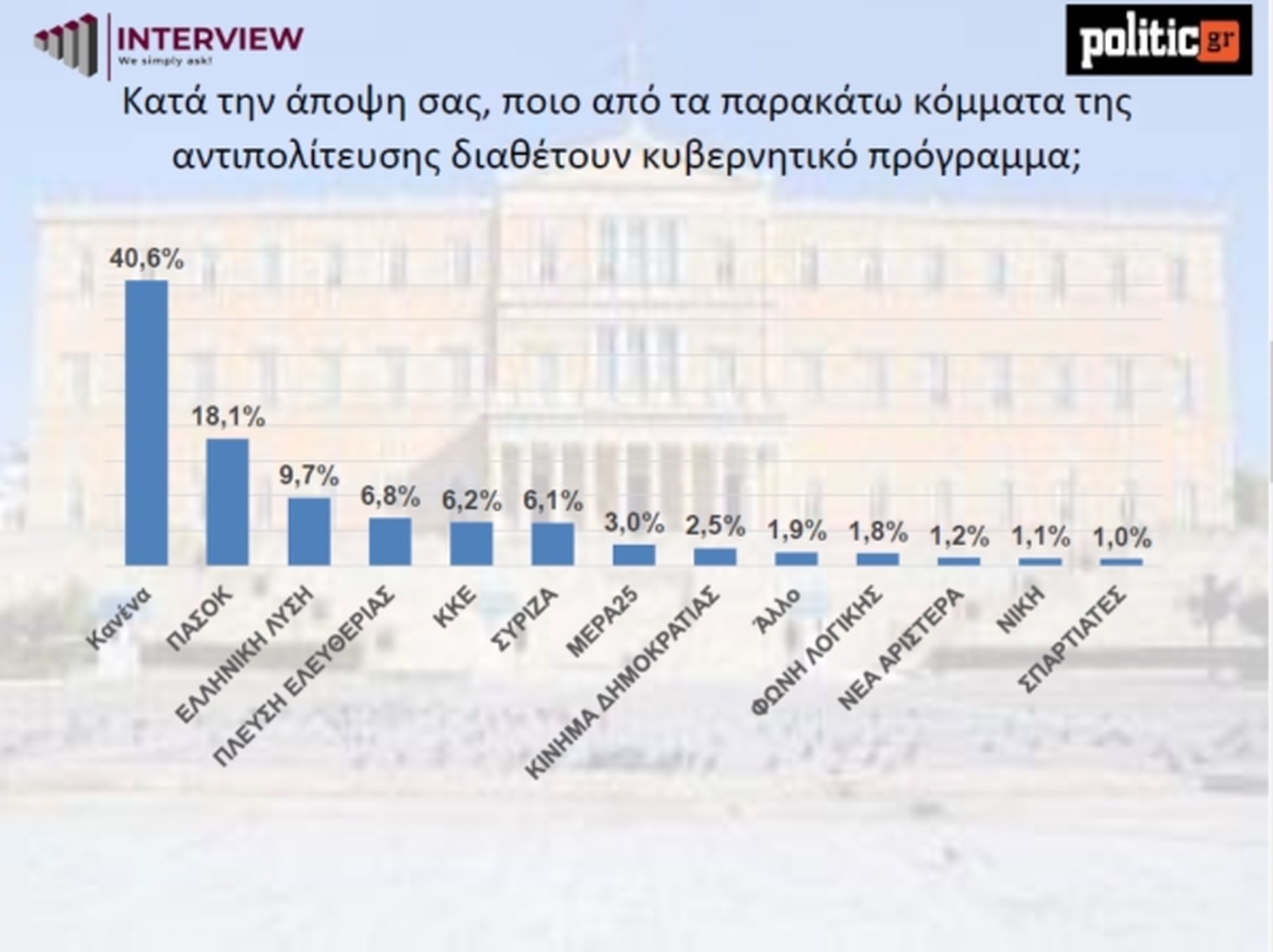 Ενδιαφέρον πολιτικό εύρημα αποτελεί το 40,6% σύμφωνα με το οποίο "κανένα κόμμα" της αντιπολίτευσης δεν έχει κυβερνητικό πρόγραμμα. Δηλαδή, τα κόμματα έχουν αφήγημα αντιπολίτευσης, αλλά όχι εναλλακτικής διακυβέρνησης.