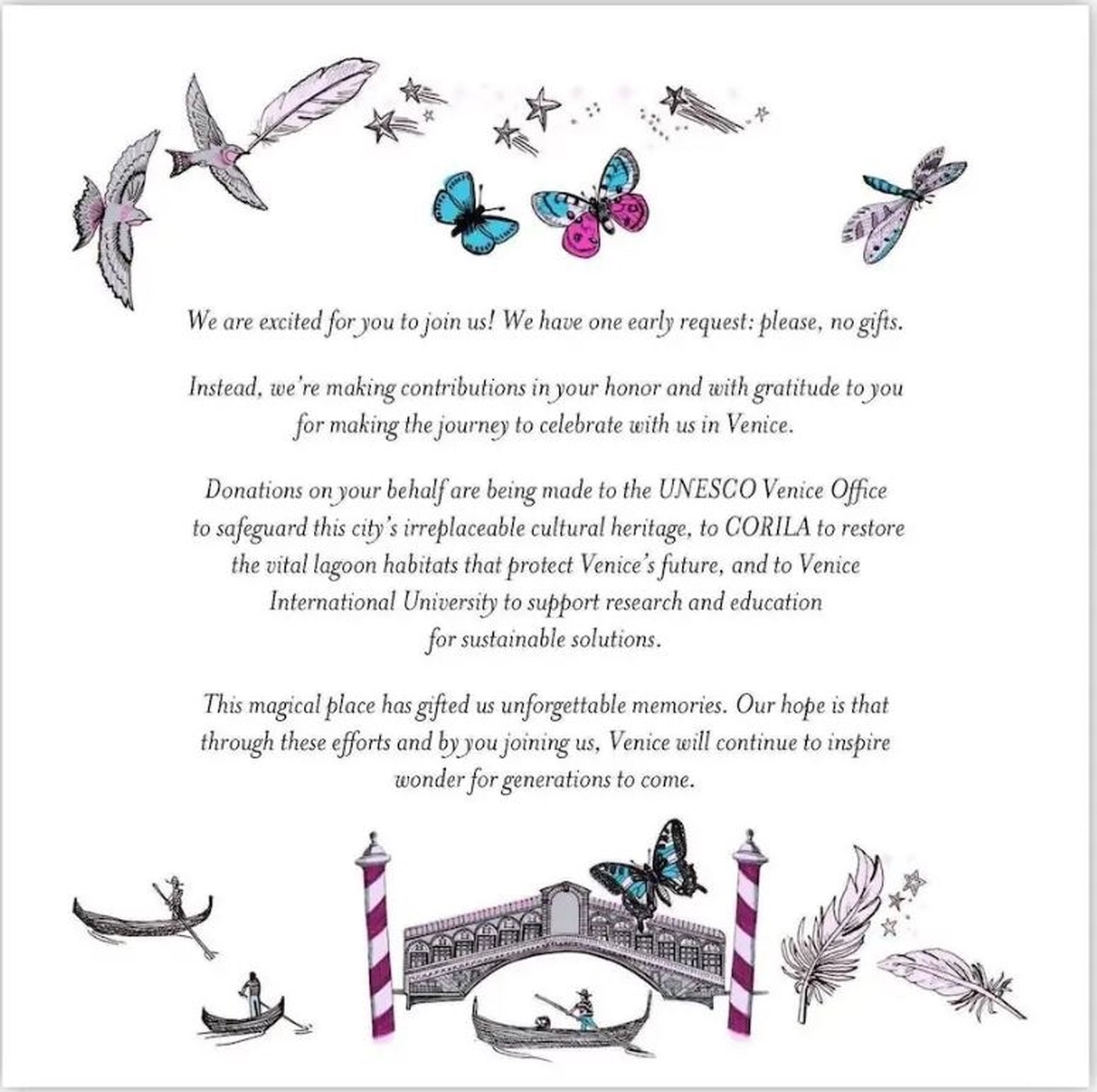"Είμαστε ενθουσιασμένοι που θα έρθετε μαζί μας! Έχουμε ένα πρώιμο αίτημα: σας παρακαλούμε, όχι δώρα. Οι δωρεές εκ μέρους σας γίνονται στο Γραφείο της UNESCO στη Βενετία για τη διαφύλαξη της πολιτιστικής κληρονομιάς της πόλης, στην CORILA για την αποκατάσταση των ζωτικών ενδιαιτημάτων της λιμνοθάλασσας που προστατεύουν το μέλλον της Βενετίας και στο Διεθνές Πανεπιστήμιο της Βενετίας για τη στήριξη της έρευνας και της εκπαίδευσης για βιώσιμες λύσεις.