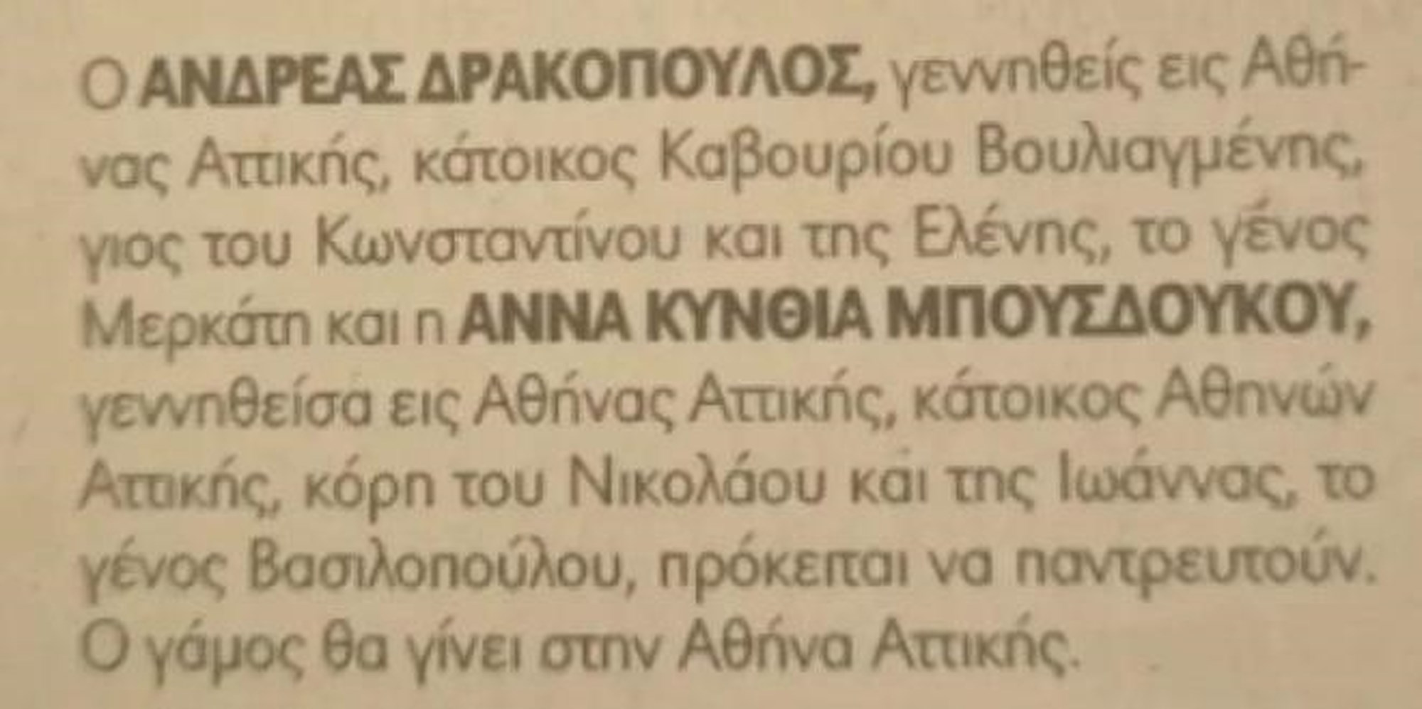 Όπως αναφέρεται στην αναγγελία του γάμου: "Ο Ανδρέας Δρακόπουλος, γεννηθείς εις Αθήνας Αττικής, κάτοικος Καβουρίου Βουλιαγμένης, γιος του Κωνσταντίνου και της Ελένης, το γένος Μερκάτη και η Άννα Κύνθια Μπουσδούκου, γεννηθείσα εις Αθήνας Αττικής, κάτοικος Αθηνών Αττικής, κόρη του Νικολάου και της Ιωάννας, το γένος Βασιλοπούλου, πρόκειται να παντρευτούν. Ο γάμος θα γίνει στην Αθήνα Αττικής".