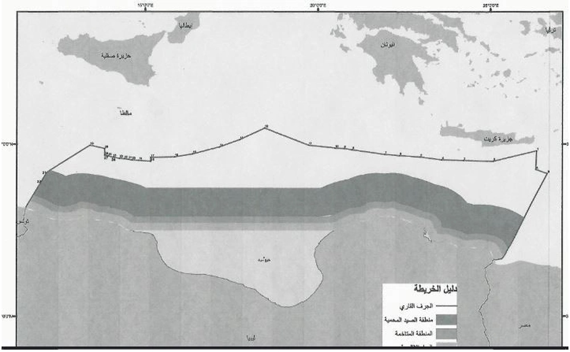 Την επίσημη δήλωση της περί των εξωτερικών ορίων της υφαλοκρηπίδας της στη Μεσόγειο γνωστοποίησε νωρίτερα η Λιβύη στον Γενικό Γραμματέα των Ηνωμένων Εθνών, μέσω ρηματικής διακοίνωσης στον ΟΗΕ, η οποία κατατέθηκε από την λιβυκή Μόνιμη Αντιπροσωπεία στις 27 Μαΐου 2025 ως επίσημο έγγραφο της 79ης Συνόδου της Γενικής Συνέλευσης, υπό το θέμα της ημερήσιας διάταξης για τους "Ωκεανούς και το Δίκαιο της Θάλασσας".