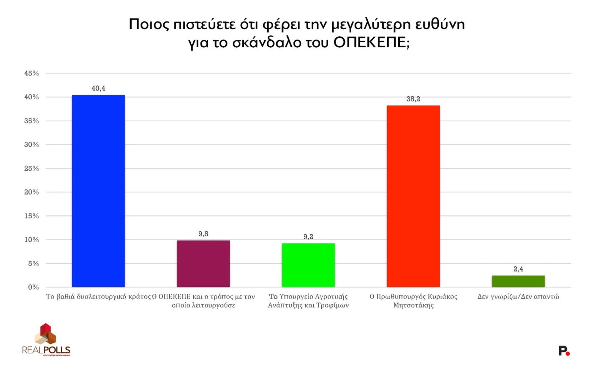 Στην ερώτηση "ποιος πιστεύετε ότι φέρει τη μεγαλύτερη ευθύνη για το σκάνδαλο του ΟΠΕΚΕΠΕ", το 40,4% απάντησε το "βαθιά δυσλειτουργικό κράτος" και το 38,2% "ο ίδιος ο πρωθυπουργός".