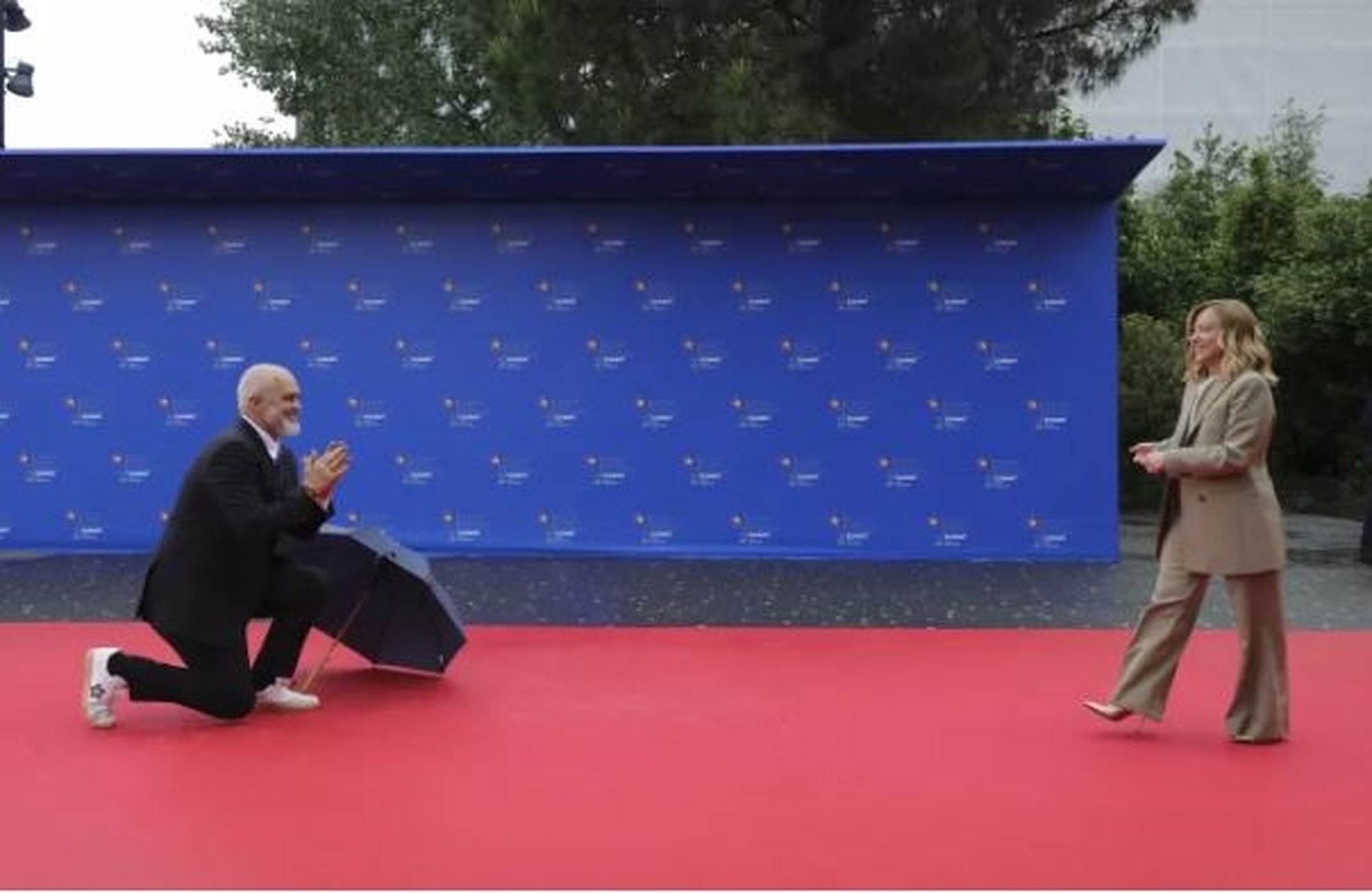 Ο Αλβανός πρωθυπουργός γονάτισε μπροστά στην Ιταλίδα ομόλογό του προτού χαιρετηθούν και αγκαλιαστούν, επαναλαμβάνοντας την ίδια κίνηση που είχε κάνει και στις 16 Μαΐου, στο περιθώριο της Συνόδου της Ευρωπαϊκής Πολιτικής Κοινότητας στα Τίρανα.