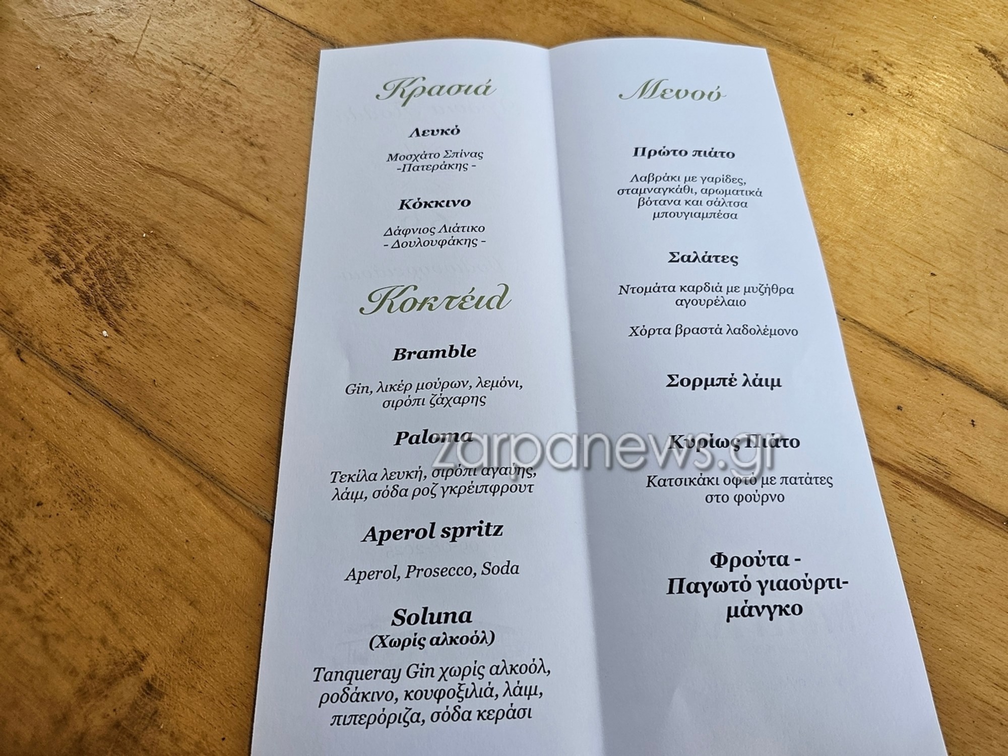 Οι καλεσμένοι απόλαυσαν αρχικά ένα από τα signature cocktails πριν περάσουν στο δείπνο το οποίο περιλάμβανε λαβράκι με γαρίδες, σταμναγκάθι, αρωματικά βότανα και σάλτσα μπουγιαμπέσα, σαλάτα ντομάτα με μυζήθρα και αγουρέλαιο, χόρτα βραστά λαδολέμονο, ενώ ως κυρίως σερβιρίστηκε κατσικάκι οφτό με πατάτες στον φούρνο.