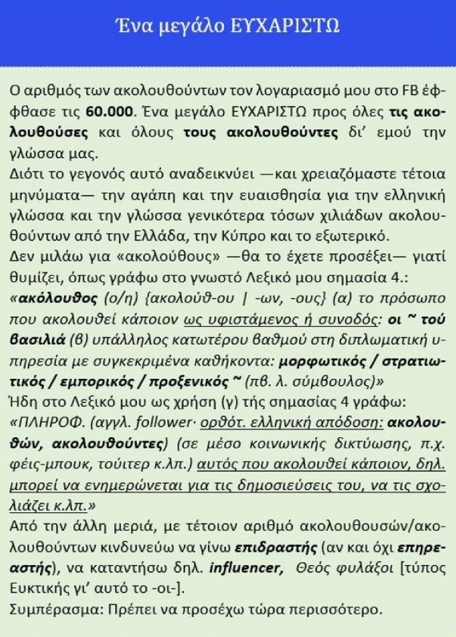 Ασχολούμενος τις τελευταίες ημέρες με τη γλώσσα των Μέσων Κοινωνικής Δικτύωσης - τις τελευταίες ημέρες είχε προτείνει τους όρους "επιδραστής" και "επιδράστρια" για τους influencer -, σχολιάζει με χιουμοριστική διάθεση: "Με τέτοιον αριθμό ακολουθούντων/ακολουθουσών, αρχίζω να γίνομαι και εγώ επιδραστής (αν και όχι επηρεαστής), κατά το ελληνικό δηλ. influencer, Θεός φυλάξοι τ’ ώτα των συμπεφωνημένων".