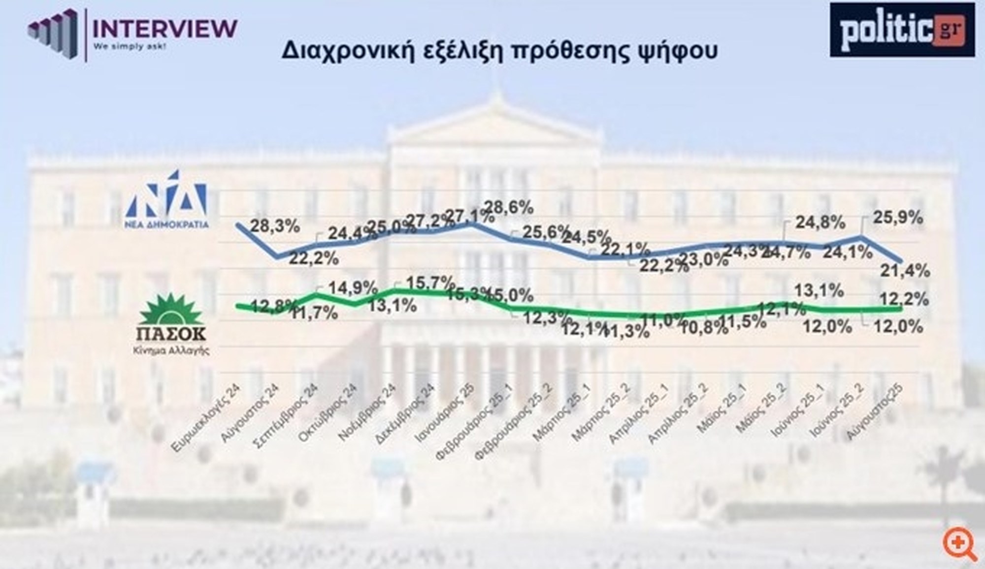Παρά το προβάδισμα, η ΝΔ καταγράφει πτώση στην πρόθεση ψήφου, σε σύγκριση με τη μέτρηση του Ιουνίου: Η Νέα Δημοκρατία υποχωρεί από το 25,9% τον Ιούνιο στο 21,4% τον Αύγουστο. Το ΠΑΣΟΚ – Κίνημα Αλλαγής παραμένει δεύτερο, σχεδόν αμετάβλητο, από το 12% στο 12,2%, χωρίς σημάδια ουσιαστικής διεύρυνσης.