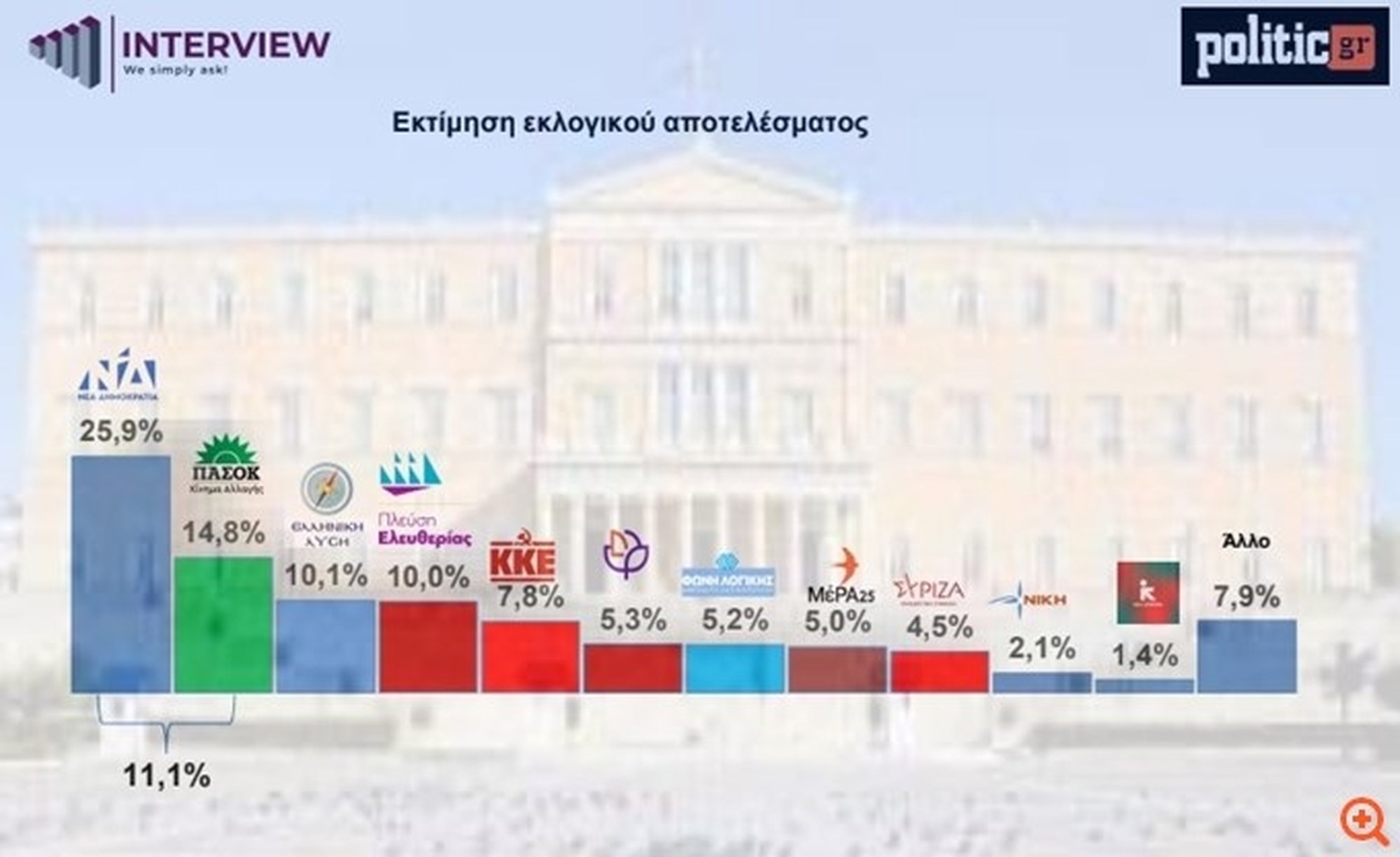 Στην 9η θέση ο ΣΥΡΙΖΑ, με ποσοστό 4,5%, και ακολουθούν Νίκη (2,1%) και Νέα Αριστερά (1,4%). Άλλο κόμμα (7,9%).