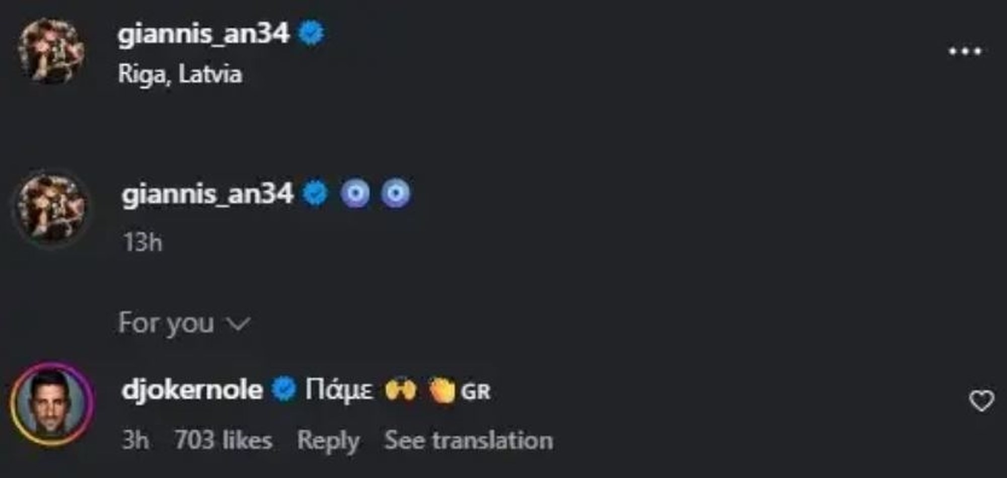 Ειδικότερα, το τελευταίο διάστημα ο Νόβακ Τζόκοβιτς βρίσκεται μόνιμα στην Ελλάδα και παρακολουθεί όλα τα αθλητικά νέα. Με δεδομένο και τον πρόσφατο αποκλεισμό της Εθνικής Σερβίας, "γιόρτασε" και αυτός την πρόκριση της Ελλάδας στα ημιτελικά του Eurobasket κόντρα στη Λιθουανία, με την Τουρκία να είναι ο επόμενος αντίπαλος "Πάμε", έγραψε στα ελληνικά ο Νόβακ Τζόκοβιτς, σχολιάζοντας την ανάρτηση του Greek Freak για την πρόκριση.