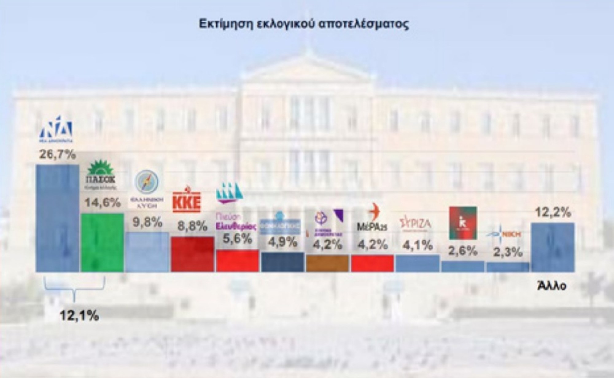 Η ΝΔ λαμβάνει ποσοστό 26,7%, το ΠΑΣΟΚ 14,6%, η Ελληνική Λύση 9,8%, το ΚΚΕ 8,8%, η Πλεύση Ελευθερίας 5,6%, η Φωνή Λογικής 4,9%, το Κίνημα Δημοκρατίας 4,2%, το ΜέΡΑ25 4,2%, ο ΣΥΡΙΖΑ 4,1%, η Νέα Αριστερά 2,6%, η Νίκη 2,3% και άλλο 12,2%.