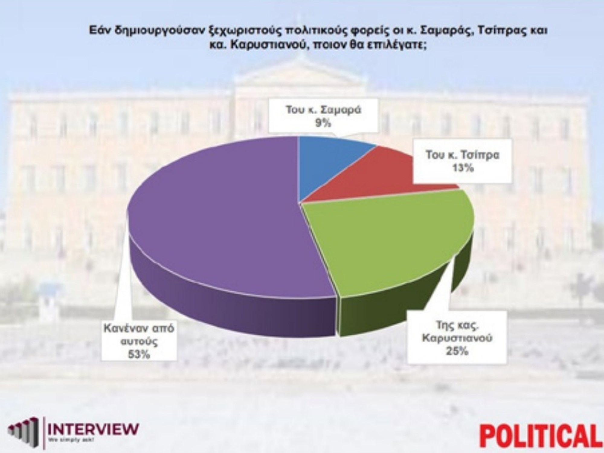 Έκπληξη, πάντως, αποτελεί το εύρημα που δείχνει ότι ένα υψηλό ποσοστό πολιτών, που αγγίζει το 25%, θα ψήφιζε ένα κόμμα της Μαρίας Καρυστιανού έναντι φορέων από Αλέξη Τσίπρα και Αντώνη Σαμαρά.