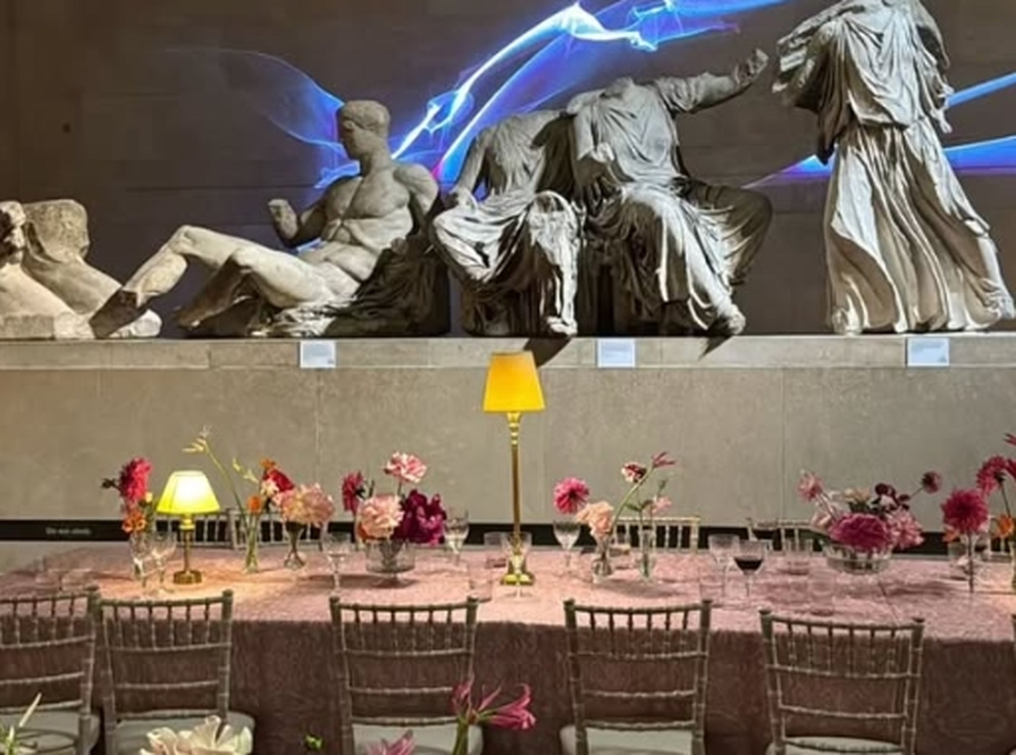 Τα τραπέζια για τους καλεσμένους στήθηκαν μέσα στην αίθουσα που φιλοξενεί τα ελληνικά αγάλματα και που η Αθήνα διεκδικεί να επαναπατριστούν στην Ελλάδα και να ενωθούν με τα Γλυπτά του Παρθενώνα που φιλοξενούνται στο Μουσείο της Ακρόπολης.