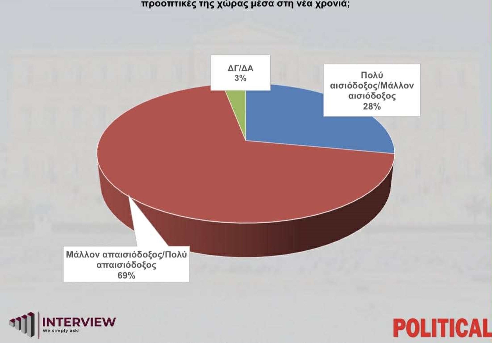 Συγκεκριμένα, στο ερώτημα "πόσο αισιόδοξος ή απαισιόδοξος είστε για τις προοπτικές της χώρας μέσα στη νέα χρονιά", το 69% δηλώνει μάλλον απαισιόδοξος/πολύ απαισιόδοξος, το 28% πολύ αισιόδοξος/μάλλον αισιόδοξος και 3% ΔΞ/ΔΑ.