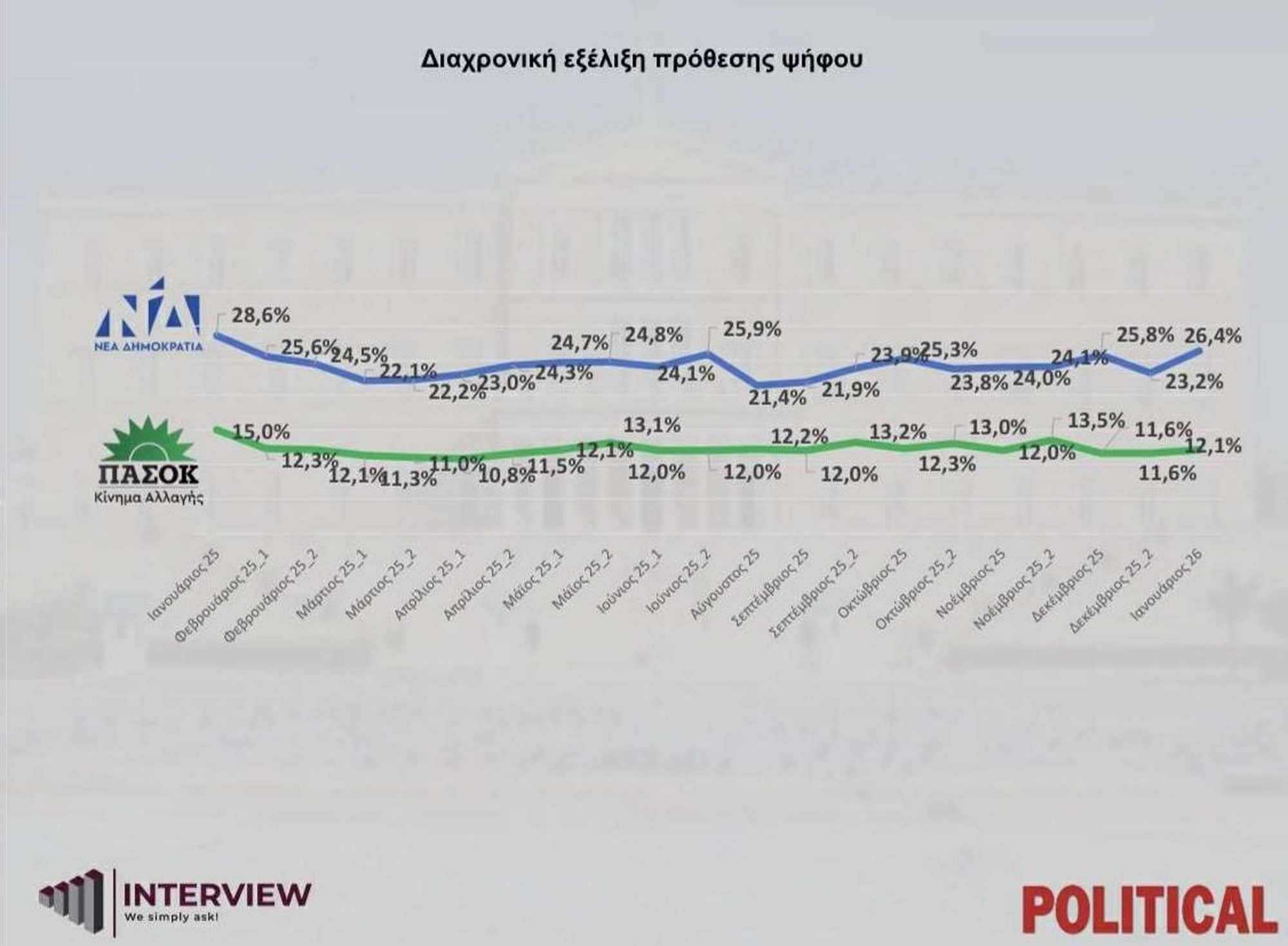 Από τα παραπάνω ευρήματα προκύπτει αύξηση των ποσοστών της ΝΔ κατά 2,8% σε σχέση με τη δημοσκόπηση της Interview τον Δεκέμβριο, ενώ ενισχυμένα κατά 0,5% είναι και τα ποσοστά του ΠΑΣΟΚ.