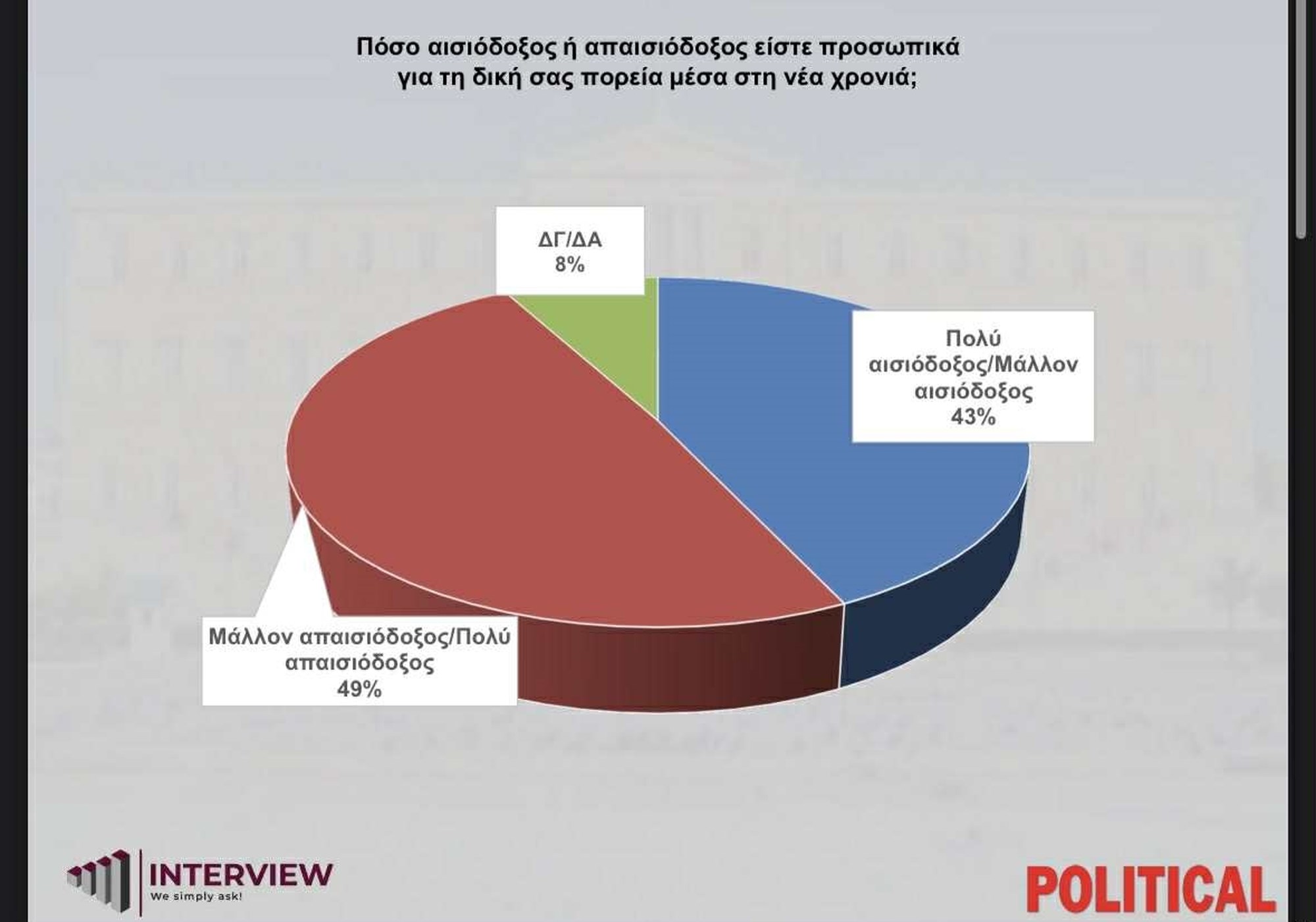 Στο επόμενο ερώτημα, "πόσο αισιόδοξος ή απαισιόδοξος είστε προσωπικά για τη δική σας πορεία μέσα στη νέα χρονιά", μάλλον απαισιόδοξος/πολύ απαισιόδοξος δηλώνει το 49%, πολύ αισιόδοξος/μάλλον αισιόδοξος το 43% και 8% ΔΞ/ΔΑ.