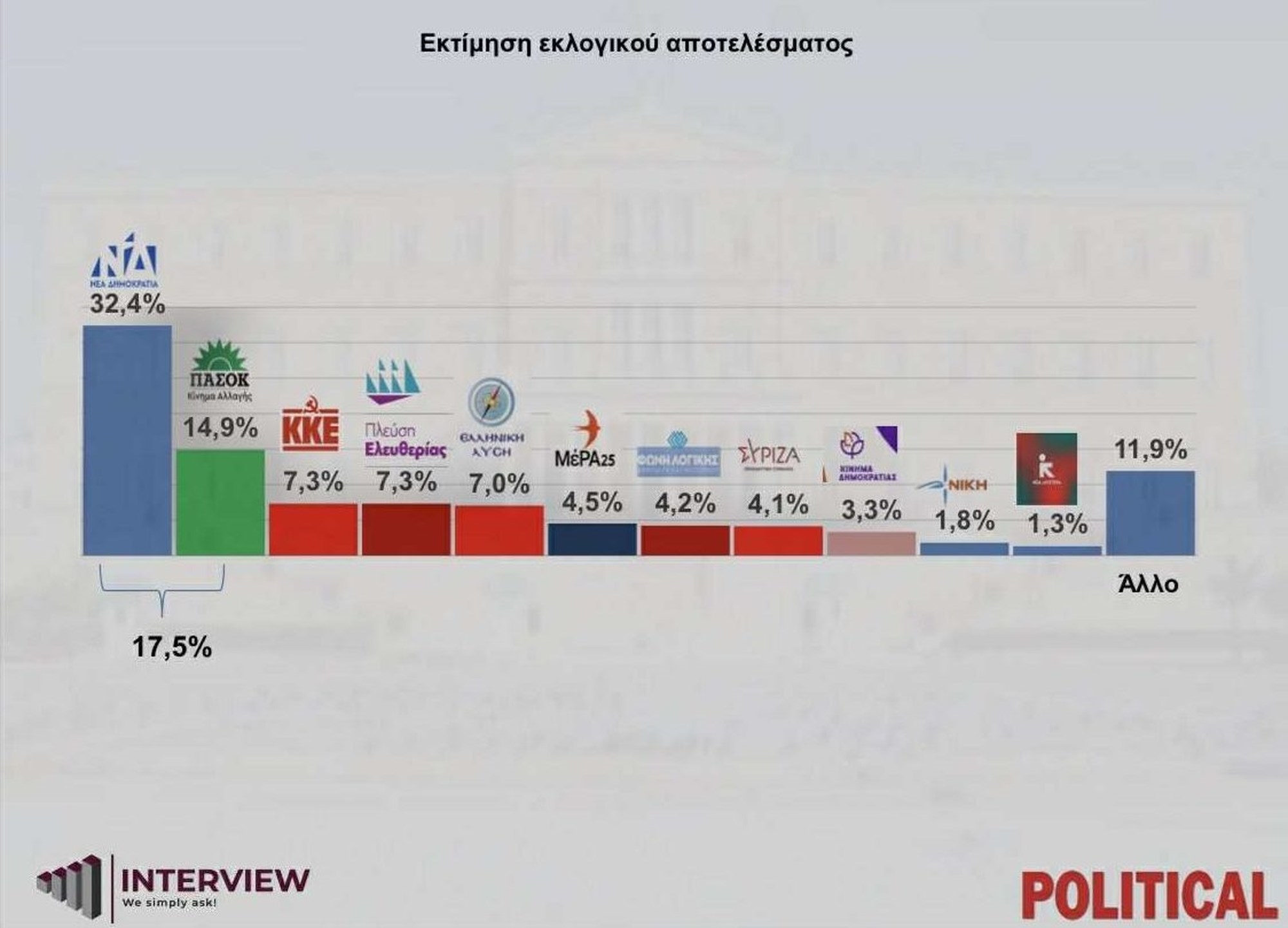 Σύμφωνα με τα στοιχεία της εκτίμησης εκλογικού αποτελέσματος, η ΝΔ συγκεντρώνει 32,4% και ακολουθούν το ΠΑΣΟΚ με 14,9%, το ΚΚΕ με 7,3%, η Πλεύση Ελευθερίας επίσης με 7,3%, η Ελληνική Λύση με 7%, το ΜέΡΑ25 με 4,5%, η Φωνή Λογικής με 4,2%, ο ΣΥΡΙΖΑ με 4,1%, το Κίνημα Δημοκρατίας με 3,3%, η Νίκη με 1,8% και η Νέα Αριστερά με 1,3%, ενώ το ποσοστό του "άλλο" διαμορφώνεται στο 11,9%.