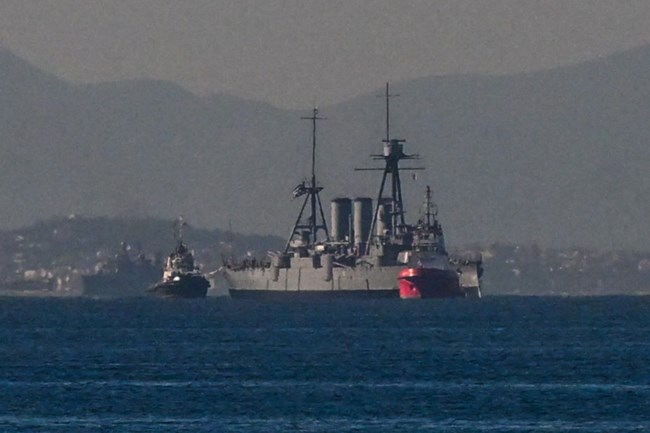 Το θωρηκτό "Αβέρωφ" πλέει στον Σαρωνικό αναμένοντας τη φρεγάτα Κίμων