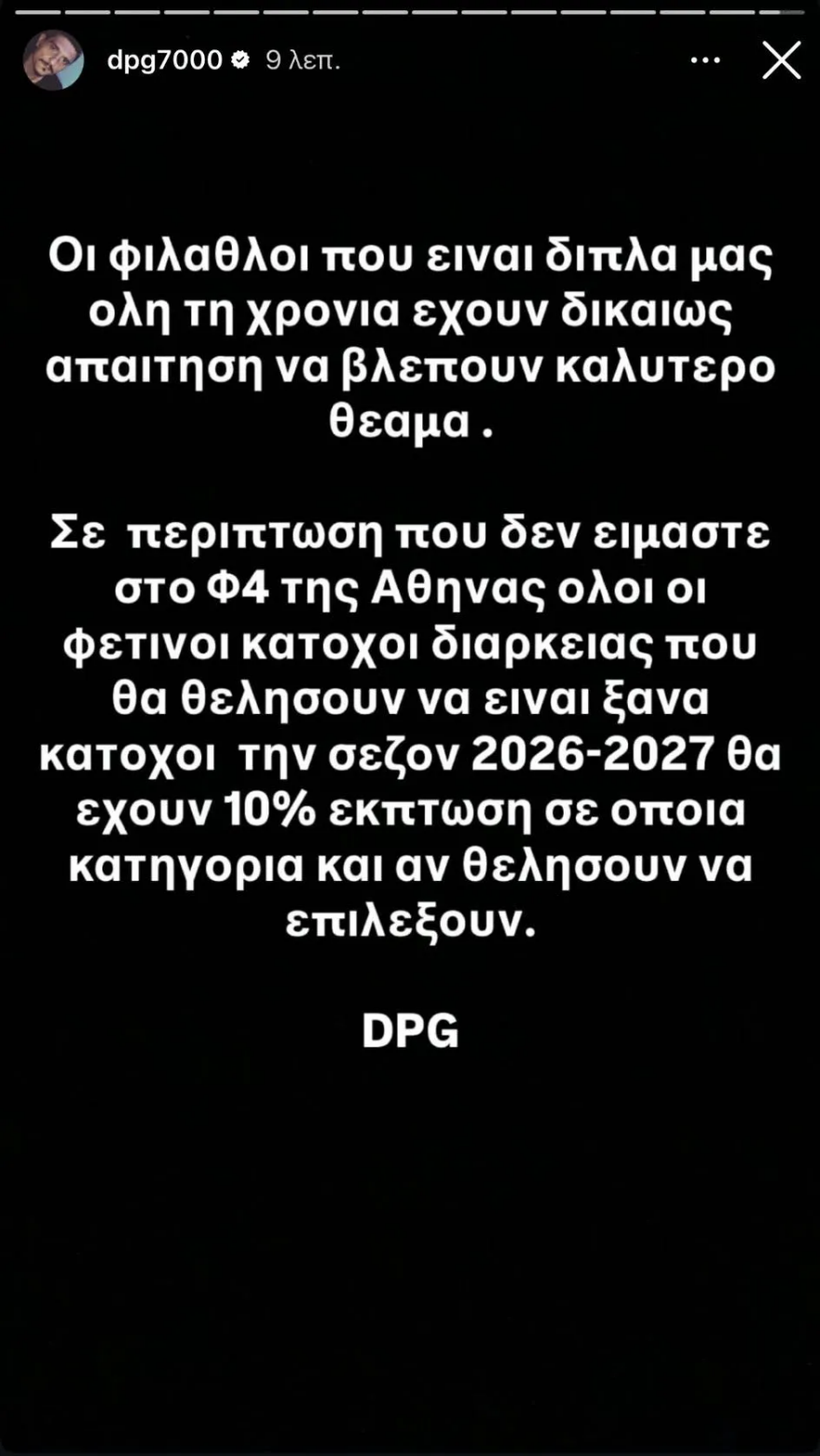 Έκπτωση 10% στους κατόχους διαρκείας αν δεν έρθει το Final FourΛίγο μετά τη λήξη του αγώνα, ο Δημήτρης Γιαννακόπουλος ενημέρωσε μέσω Instagram story πως οι κάτοχοι διαρκείας της φετινής σεζόν θα έχουν έκπτωση 10% για την επόμενη αγωνιστική περίοδο, σε περίπτωση που η ομάδα δεν καταφέρει να προκριθεί στο Final Four της Αθήνας.